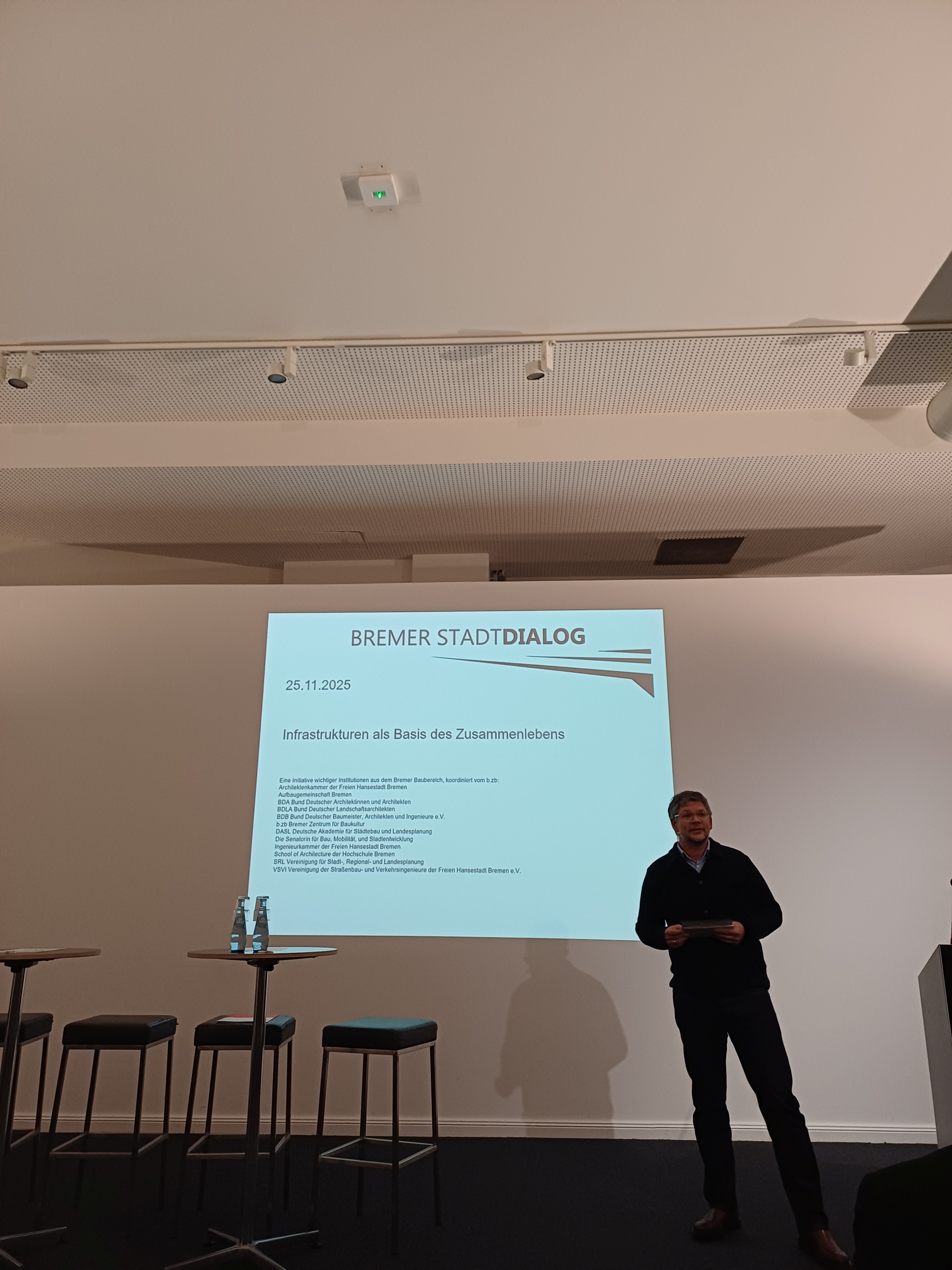 Der Bremer Stadtdialog griff am 25.November 2025 ein Thema auf, das hohe Ingenieurrelevanz aufweist: Infrastrukturen, vor allem für Mobilität und deren Bedeutung für die aktuelle und zukünftige Stadtentwicklung. Die Patenschaft für den Stadtdialog übernahmen die Ingenieurkammer Bremen und Vereinigung der Straßenbau- und Verkehrsingenieure der Freien Hansestadt Bremen in Kooperation. Der Landesvorsitzende der VSVI Bremen und Kammervizepräsident Markus Mey begrüßte rund 80 interessierte Gäste im Hause der Wissenschaft, er moderierte gleichzeitig die Veranstaltung.